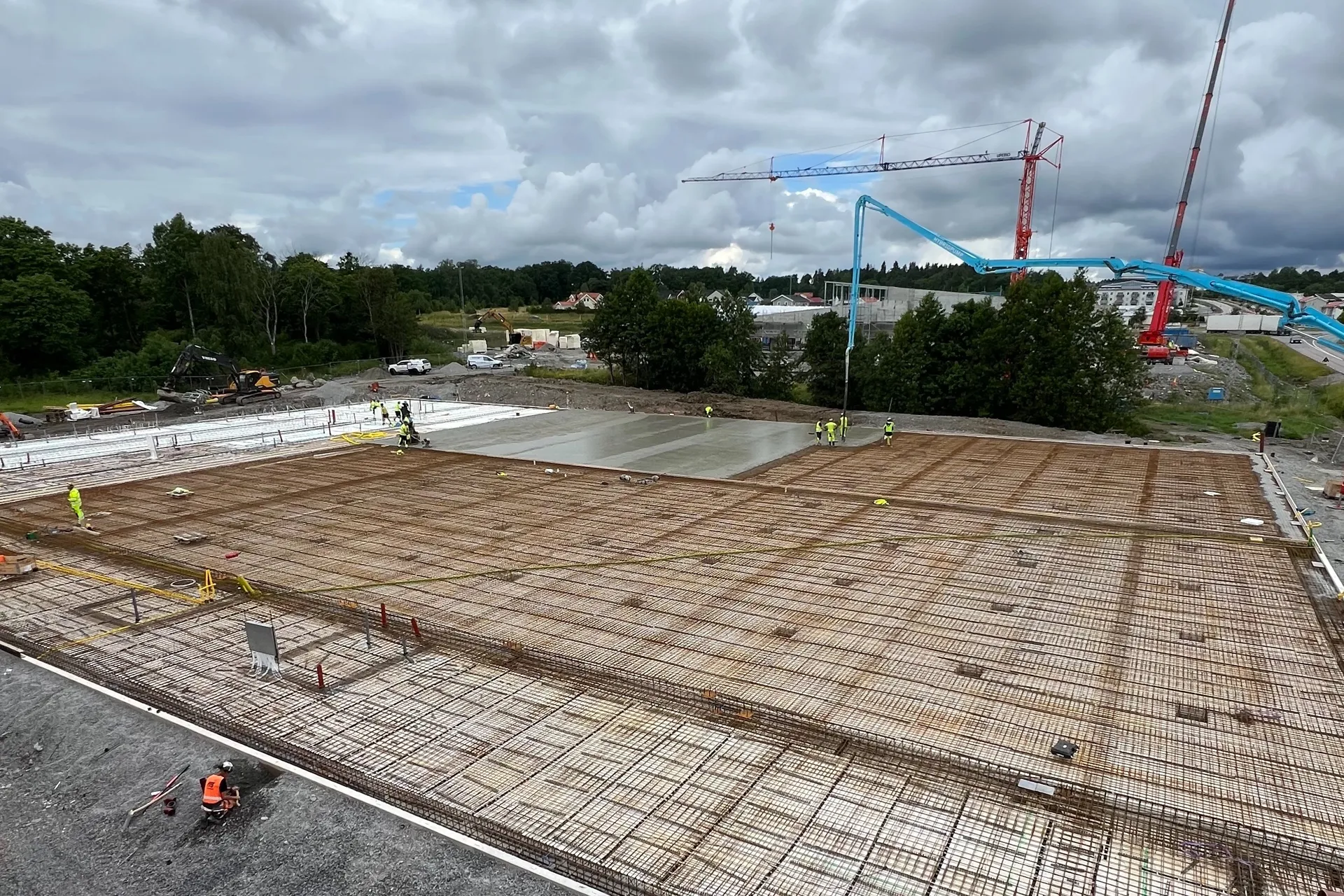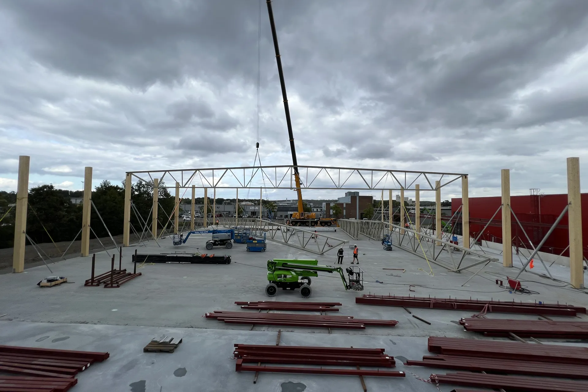 Just nu pågår arbetet med att resa stommen till sporthallen. Både stål- och limträkonstruktion. BJ Gruppen utför denna etapp för oss.