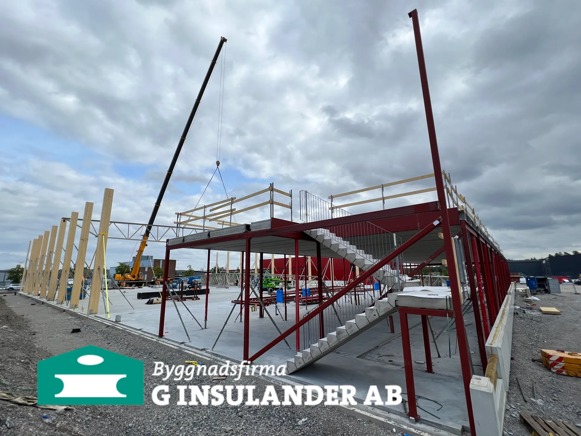 Just nu pågår arbetet med att resa stommen till sporthallen. Både stål- och limträkonstruktion. BJ Gruppen utför denna etapp för oss.