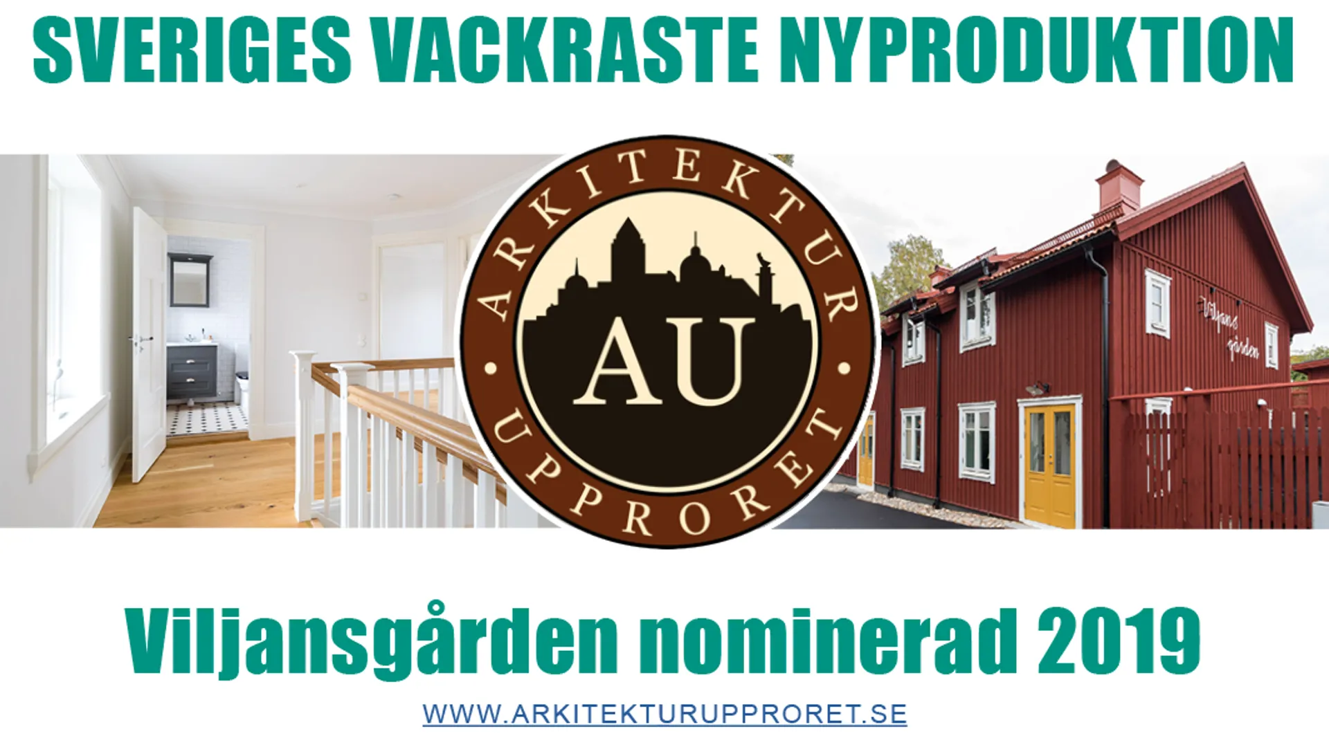 Viljansgården har som ett av tolv projekt nominerats till Arkitekturupprorets utmärkelse "Sveriges vackraste nyproduktion - 2019"